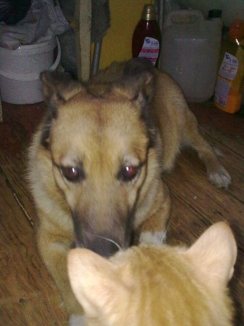 "Может кто-нибудь помочь машиной и врачом. Хотя бы узнать, что она не больная инфекционным заболеванием. Собака не ходит, максимум, что она может-это немного привстать. Неизвестно отчего она падала (по моему дело не только в обморожении). Убрали перегородки с коридора. К кошкам относится нормально (пока-что). С Сарой не конфликтуют (тоже пока). Покормили её (каша гречневая с мясом, ела жадно и с удовольствием) но с трудом, вся еда вываливается у неё изо рта. Ест лежа, голова горизонтально полу....... sad.gif Форумчане, не бросайте нас в такое трудное время, пожалуйста. _help_.gif _byby_.gif"