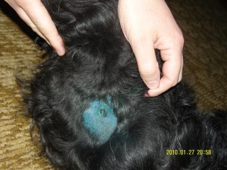 Зара уже чувствует себя по лучше, правда на ноги так и не встает. У нее очень сильный отек между передними лапами и в области шеи. Собака реально родилась в рубашке. Я вообще не понимаю как так у нее пуля прошла, и ничего не задела. Пуля вошла с одной стороны в месте между шеей и основанием лапы(как бы плечо) и вышла с другой стороны в шее с верху