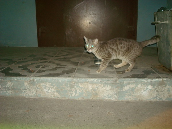 Собаку, можно сказать, не испугался. Не знаю, откуда он взялся, но он не уходит. Малыш очень ласковый, красивый - фото ночные, пока других нет. Окрас - серый с пятными, как леопардик, и глаза желто-зеленые. То ли потерялся, то ли выкинули