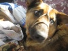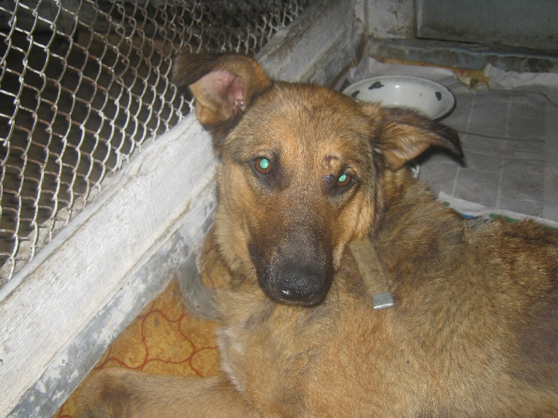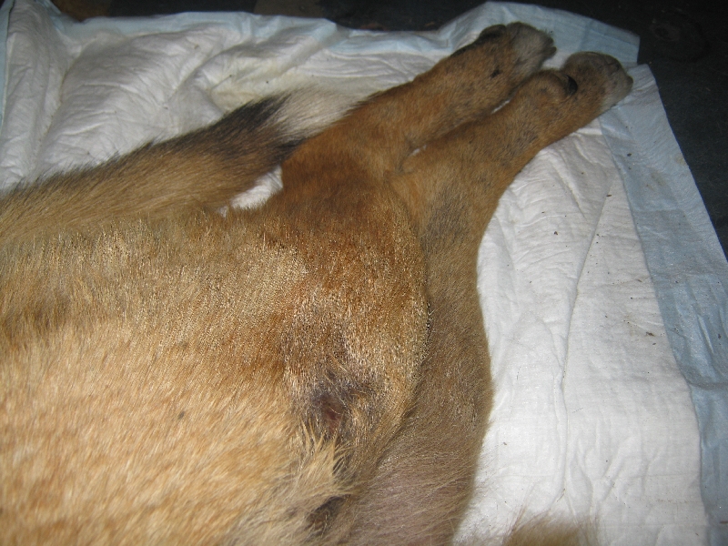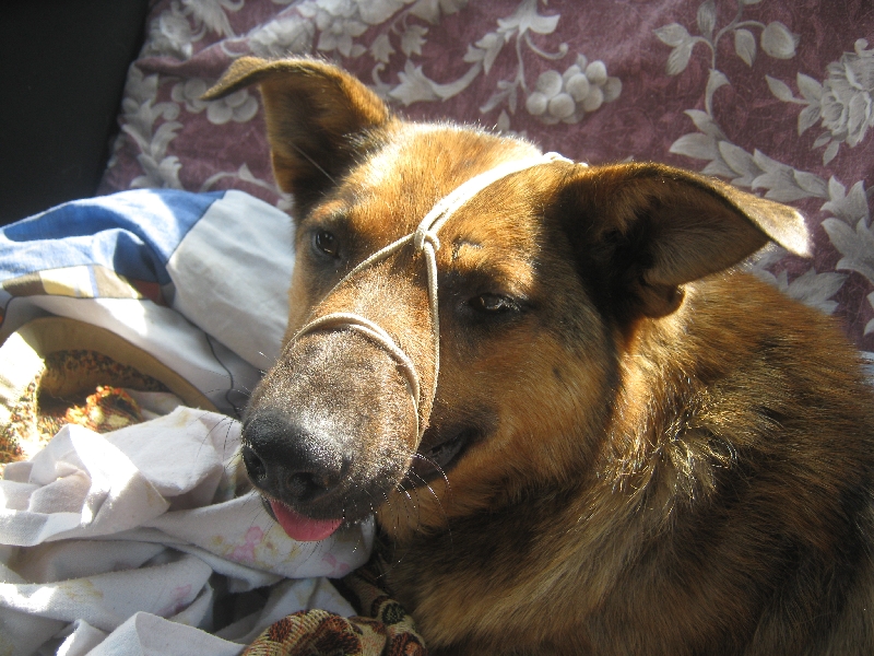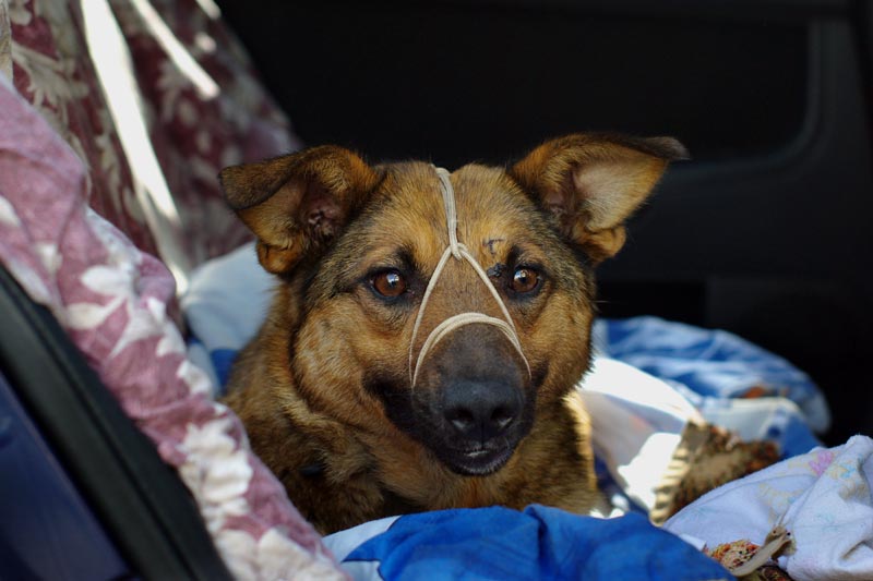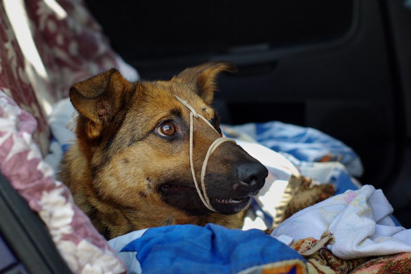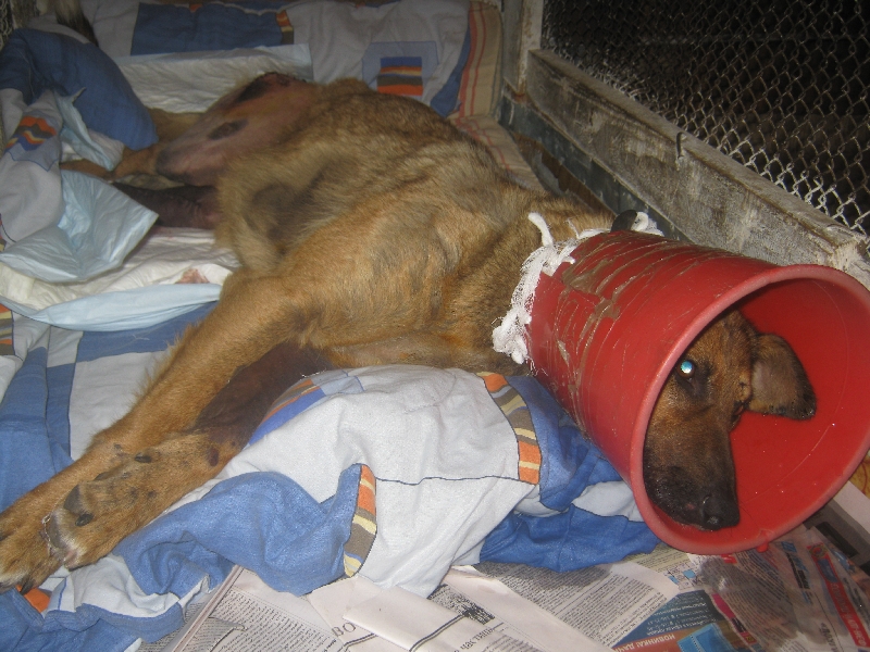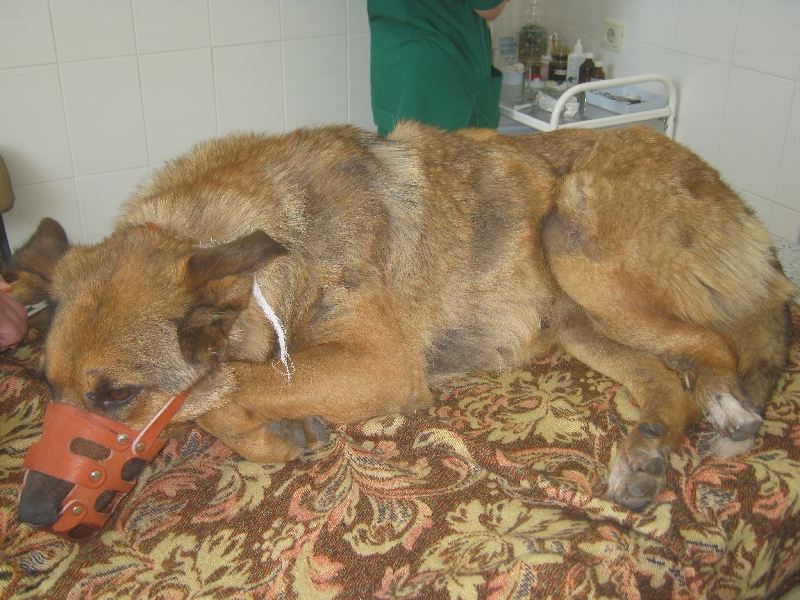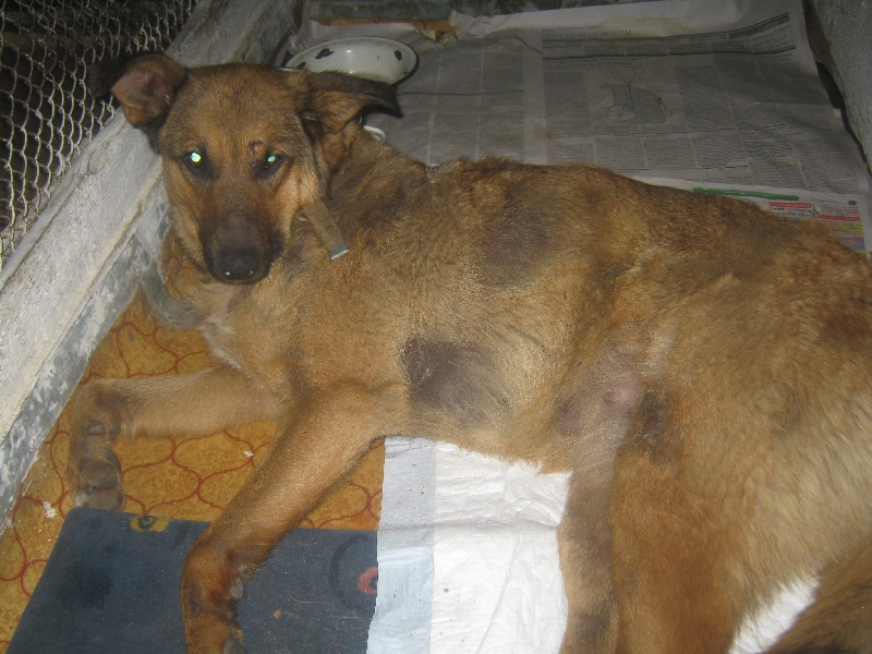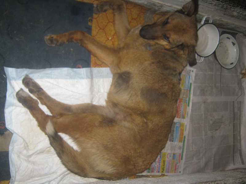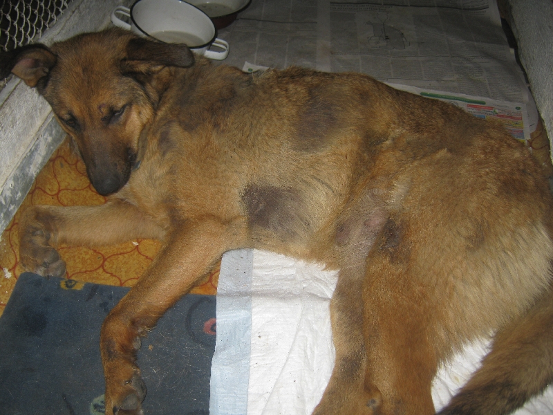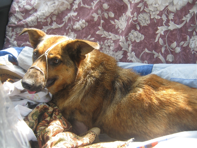 14 июля собачку сбила машина по ул. Б.Богаткова 157.В приют Академгородка позвонили две женщины и просили помочь. Приехав на место, сотрудники приюта обнаружили довольно крупную пёску, которую приглашенные солдаты пытались положить на строительные носилки. Собака лежала не двигаясь, было