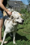 Девочка наша на месте, жарко ей ОЧЕНЬ, налила ей воды холодной, печень она не стала есть, много мух уже летало, выкинула. Сейчас пойду покупать ошейник и намордник. На ошейнике напишу свой телефон, мало ли что случится, пока она тут на улице, в свободном, так сказать, доступе, лежит.