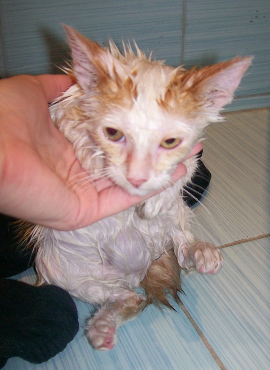 О котенке: котик, где-то около 4 месяцев, вообще он очень красивый, шерсть ооочень мягкая, на ощупь похож на кролика, наверное котенок что на улице находится недавно. Когда мыла его, он не шевелился, феном сушила - тоже. Обнаружила только 2 блохи и мне кажется, что власоеды, но может я и ошибаюсь. Помыла хорошо его шампунем от блох, власоедов и пр. Сейчас сидит весь скукоженный, видимо болит у него животик.