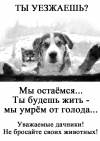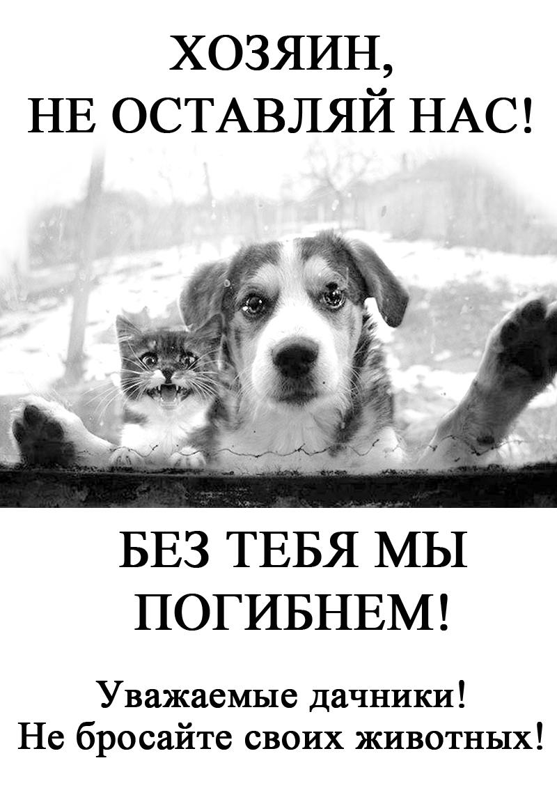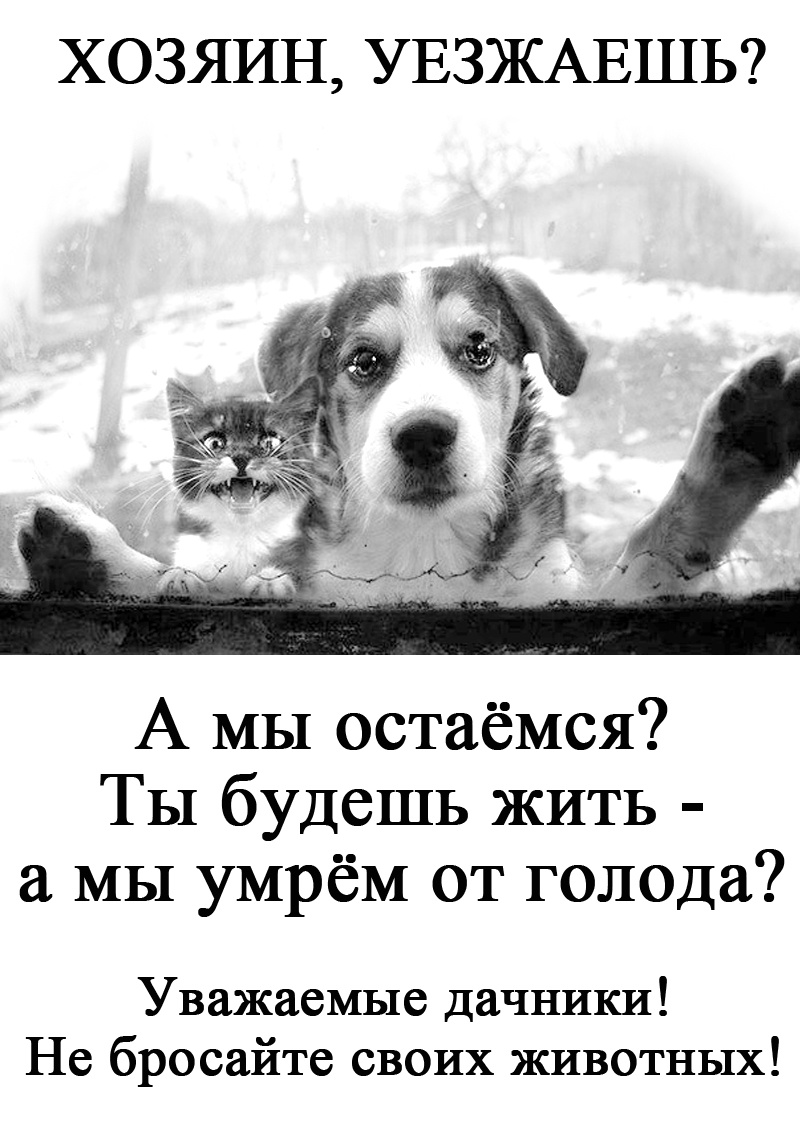 Что-то не пойму - где Вы лирику увидели? Т.е. стих на три страницы было нормально, а две-три фразы - лирика? Куда уж корочеНет, стих на три страницы тоже не считаю нормальным для плаката. Просто я ввязалась в обсуждение на этом этапе. Так вот, я пока обдумывала, меня Ира опередила, я поддержала, и предложила свой вариант, который написала. Мои соображения: всё-таки это плакат, должно быть кратко, поэтому убраны "уважаемые дачники" и лирические вступления, далее, Ира выразила мысль, что к некоторым людям животные на даче прибиваются, и они не считают их своими и не решаются их забрать с собой, поэтому убран "хозяин", ну и "умереть от голода" трансформировано в "погибнуть", т.к. это понятие более широкое. ИМХО"Не бросайте животных на дачах!" - т.е. нижнюю строку вообще убрать? Ту, где написано - ув.дачники, не бросайте своих животных.