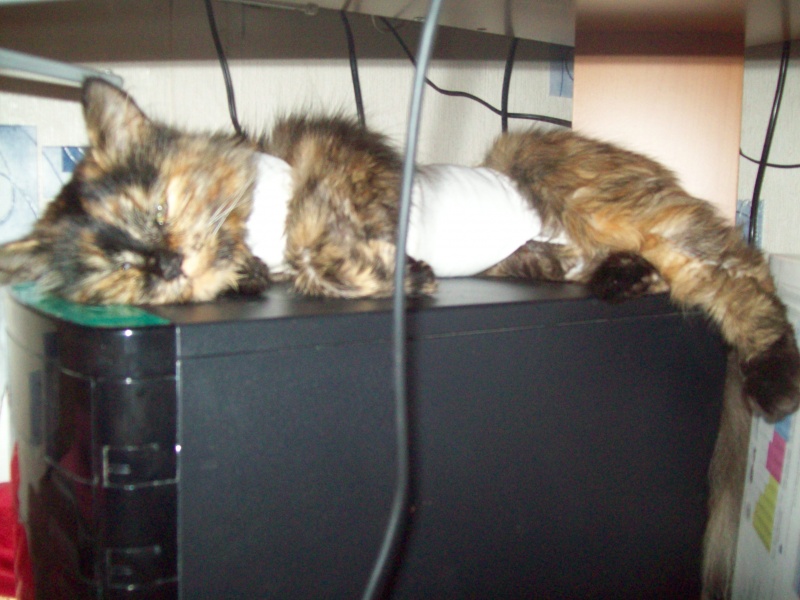 Что-то совсем растерялась...Посмотрите как мы спим на системнике после того, как курочки напёрлись.умиляет, у нее наверно шовчик ноет, а там тепло исходит, вот она и греется