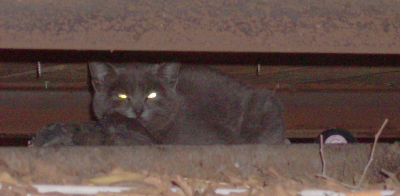 Гоняли котейца туда сюда, но наконец он не выдерживал и сиганул из-под будки. Реакция у меня явно оставляет желать лучшего так он сиганул мимо меня. Мы погнались за ним (ней), а потом это серое существо просто растворилось в полумраке задворков киосков. Куда исчез непонятно, все в округе облазили