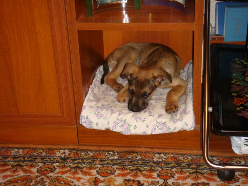 . Сейчас приучаем щенка к клетке, то есть, кормим его там, но сам он по доброй воле туда ни-ни. Вот такой растёт парень. На людях скромный, даже пугливый, а в кругу своих озорник и непоседа