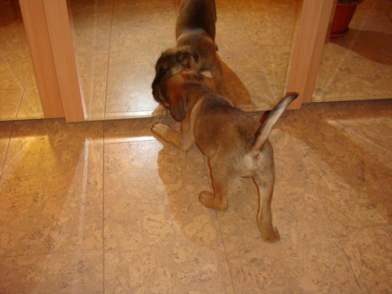, нашли один мячик и тряпочки треплет, а ещё лапы разъезжаются, пол скользкий. Сегодня его уже не рвало, и какал нормально, как говорят медики «стул оформился». Лает на своё отражение в зеркале