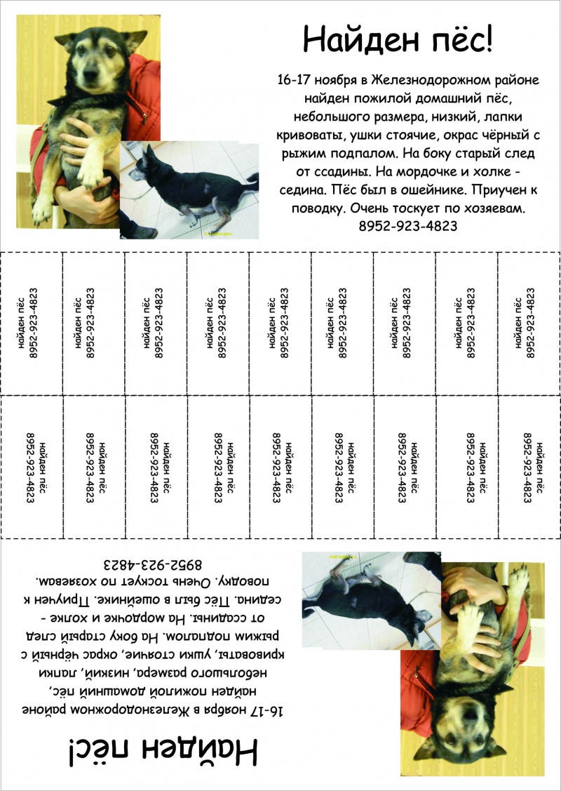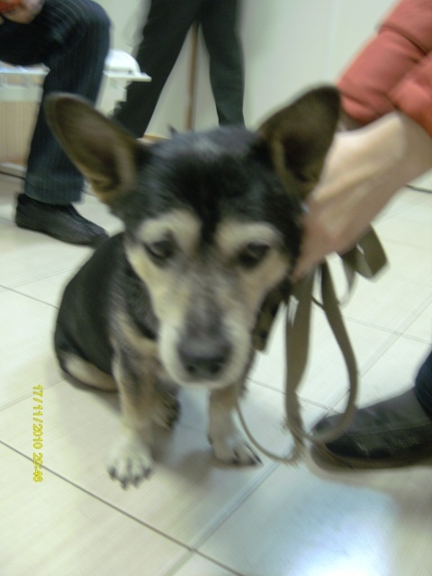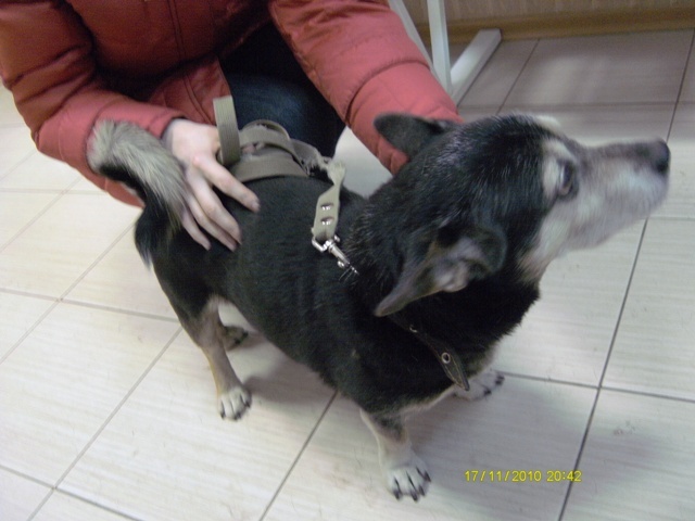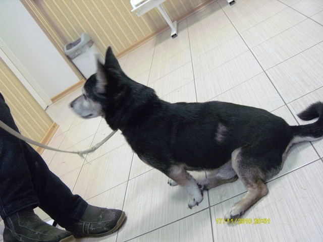 Теперь о самом песе.Маленький таксообразный кобелек,черный,с рыжими кривыми ножками,временами чуть прихрамывает.Ушки стоят,мордочка маленькая.На нем был старенький ошейник.На боку,кажется левом,выдран клок шерсти,диаметром примерно 5 см,но ссадина застарелая,его не беспокоит.Любит мужчин,с большим удовольствием общался с мужем Дианы,чем с нами.Прекрасно ходит на поводке,любит сидеть на ручках.Подвывал периодически,но когда брали на руки,успокаивался.Машину,по моему мнению,знает,так как сидел достаточно спокойно,но очень волновался,когда кто-то выходил. Поместили его в теплый вольер у Катерины...