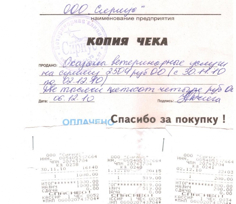 Второй - на 285 руб. (покупка препаратов 2.12) я потеряла, когда доставала из сумки щенка. Квитанций в "Сириусе" нет. Потому полная сумма указана в копии чека, а на сумму 285 руб. (входящую в 2504 руб.) мне выдали отдельную накладную вместо чека. Viyo - Роман Николаевич заменил Ветелак, которого не было. Если у кого-то есть сомнения - в "Сириусе" все подтвердят. Если накладная - не документ, могу внести свои деньги, как изначально и хотела, обнаружив потерю чека.