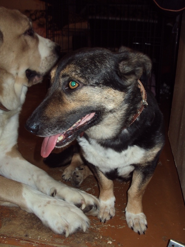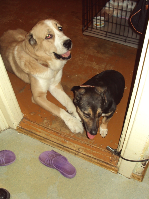 Мы ее выпустили. Тут же из будки, которая как оказалось у них есть просто запрятана так, что сразу и не увидишь, показалась ее дочь. Они обнюхались и с веселым лаем унеслись.