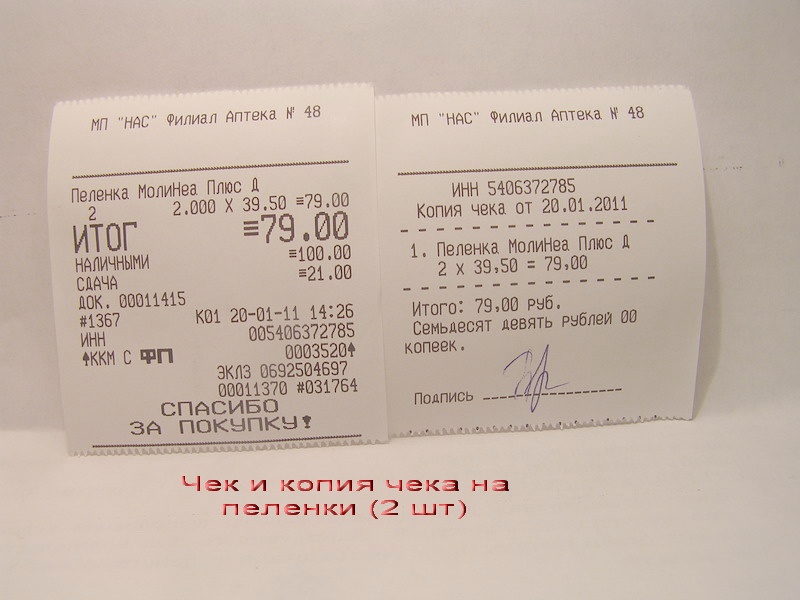 На пеленки впитыв. – 79 руб. - чек и копия чека от 20.01.11 г.