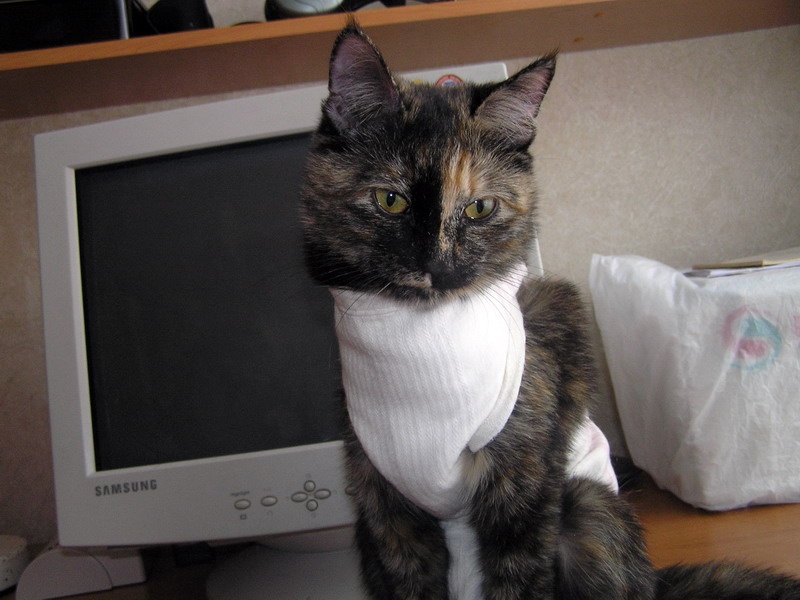 Операция была сегодня в 16-00. В 17-00 я ее забрала из клиники. Сейчас лежит спит в переноске около батареи, хотя у нас в квартире очень тепло. На осмотр шва сказали прийти в среду или четверг. Дома обрабатывать невелено было.