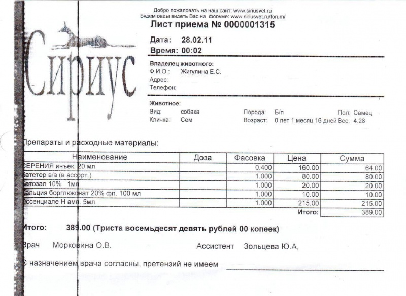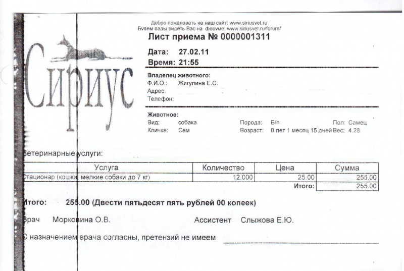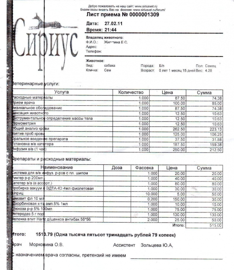 А на счет врачей Сириуса… так предварительного диагноза никакого не было! В ЦВК не дали даже лечебную программу, в которой должно быть указано, что делали щенку. Обкололи чем-то и сказали «идите дальше наблюдайте!» Так что и обсуждать-то нечего было. И куда звонить-то, мы Сэма привезли в 22 часа, а ЦВК работает до 21! Посидеть попить чайка, подождать когда врачи выйдут на работу и обсудить непонятно что, а щенок умрет за это время?! Так что сами пользуйтесь своим головным мозгом!