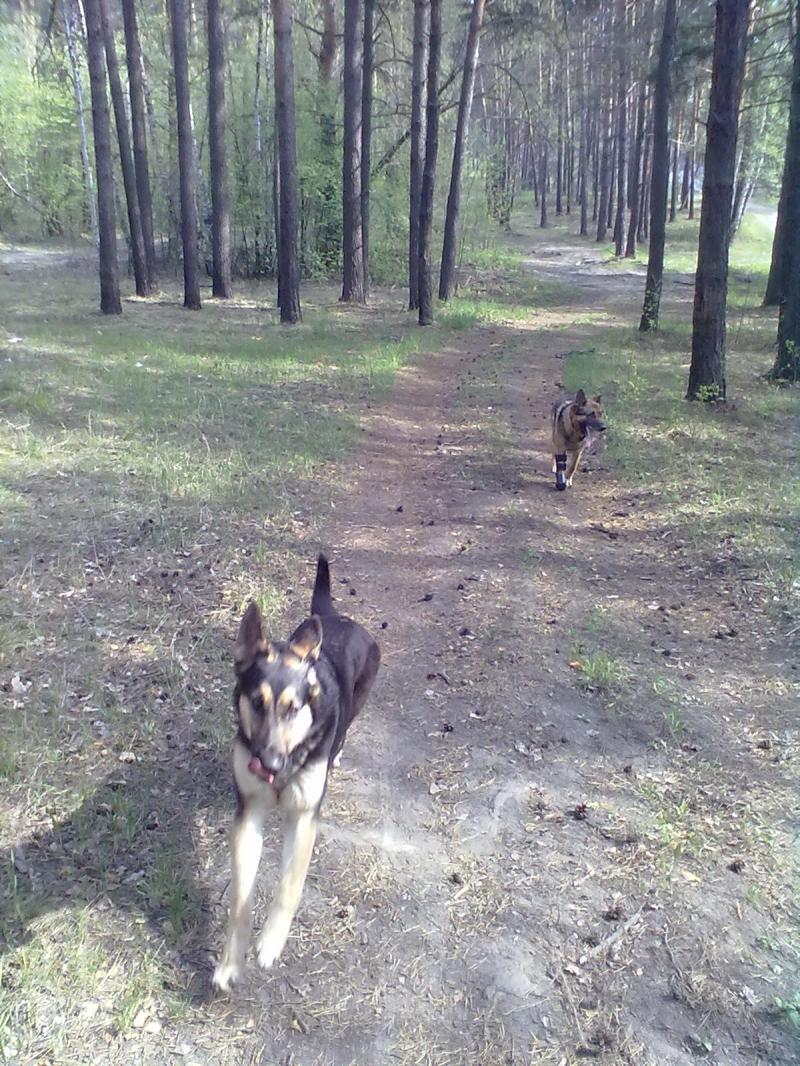 а вот вам фото из леса вот так мы гуляем. Лапа у Рекса полностью заросла!!! Ура! И протез ему больше не трет, кожа загрубела! Так что теперь в движении его не ограничиваю, гуляем столько сколько хочет