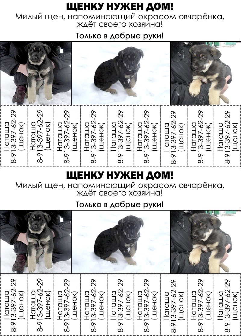 ) Но, т.к ему 85 лет и здоровье, ну совсем не очень...Нам нужно постараться быстрее его пристроить.Боюсь, что до выходных я врят ли смогу заняться его пиаром...Собственно, дорогие форумчане, просьба моя вот в чем. У кого может есть "лишние звоночки" на овчароидных малышей. Или, может, кто отдал уже, а звонки идут - будьте добры, переводите, пожалуйста ( желательно адекватные, т.к отсеивать г...но в связи с ответственной работой нет времени физически, да и щен на овчаренка похож очень!).Я буду вам очень благодарна!!! Мой тел: 8-913-397-62-29 Наташа, моя "коллега" 8-961-870-85-65 Лена.