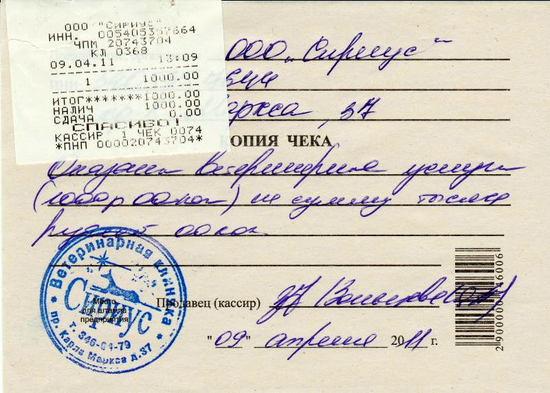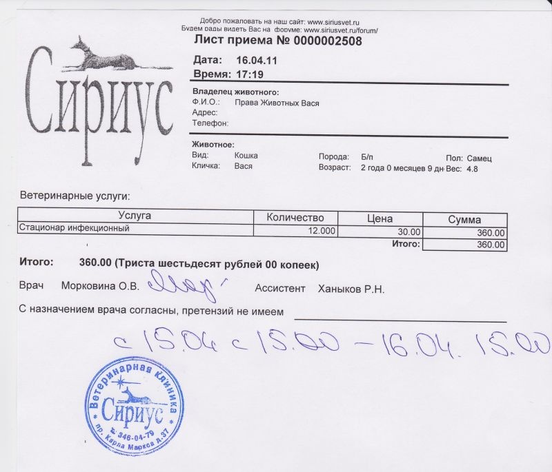 , по договору с Правами животных Васе в Сириусе предоставили клетку в стационаре со скидкой и все ветуслуги тоже со скидкой 15 %. Врачей и помощников клиники Сириус за лечение и внимание к нашей персоне.