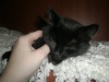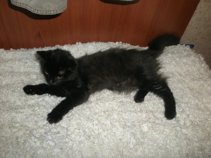 Котенок черный, пушистый, 5-6 мес. Жует листья, слизывает капельки дождя.