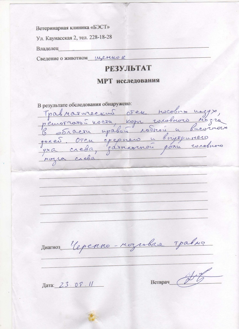 Предварительный диагноз черепно-мозговая травма. Или ударило кроху машиной, либо пытались загрыть собаки ( как предположили врачи ) там рядом стройка, частный сектор..Есть местная стая собак...