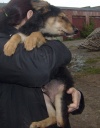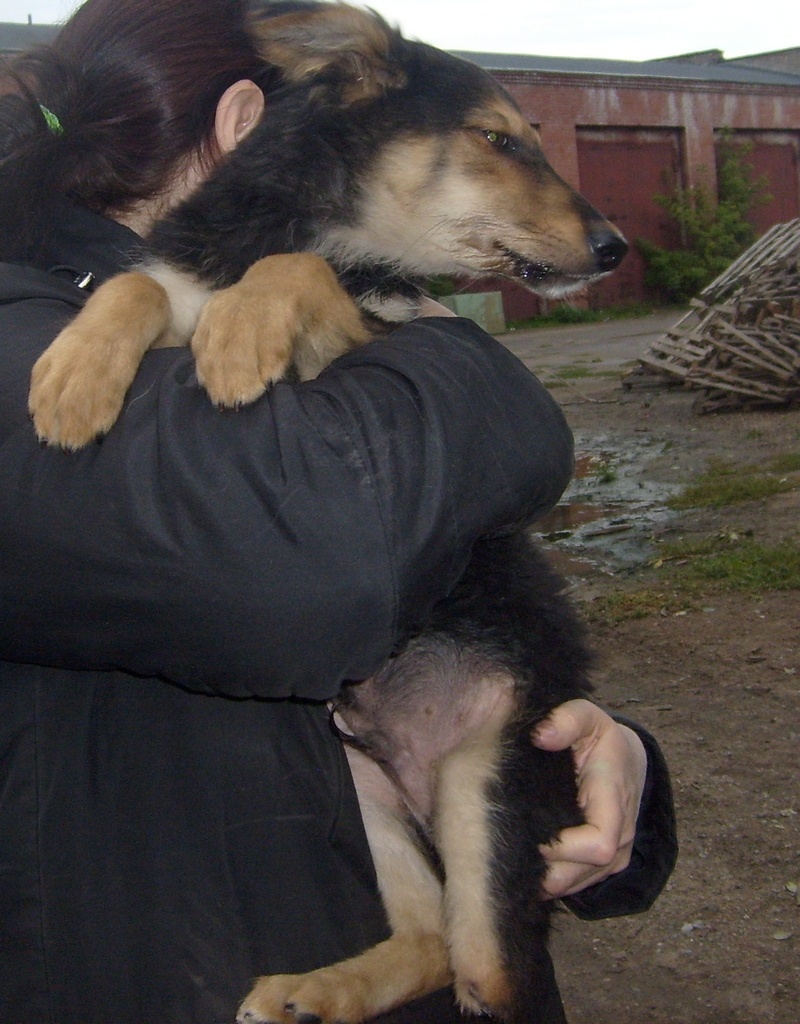 Решили попробовать ловить собаку на щенков. Поместили из в переноску и стали ждать.Вскоре собака вернулась и залезла в нору.Я соорудила новую удавку из поводка и засунула её в нору и накинула на голову собаке И таким образом вытащила ее из норы. На руках дотащила до машины.Собака оказалась очень тяжелой-около 30 кг.Дину отвезли на передержку до того,пока не перегорит молоко,а потом будем стерилизовать. Щенков забрали себе для поисков хозяина.