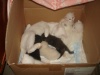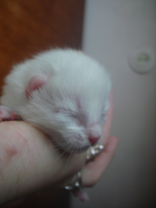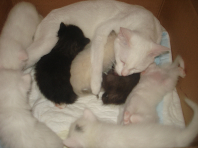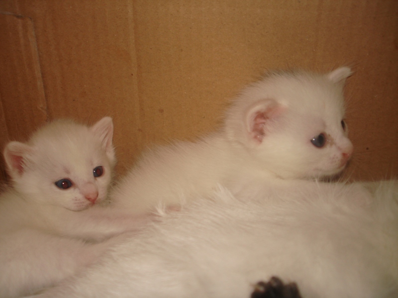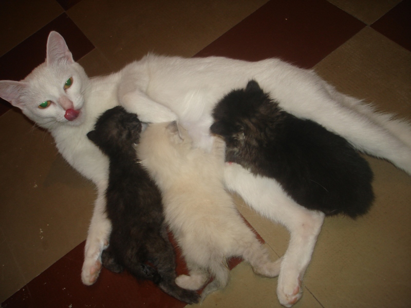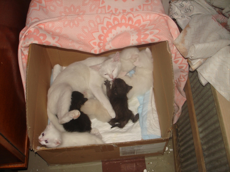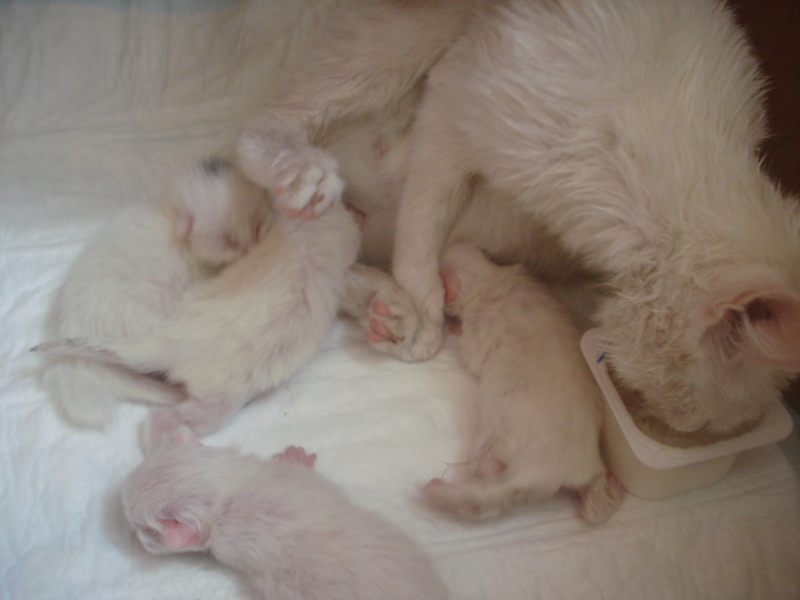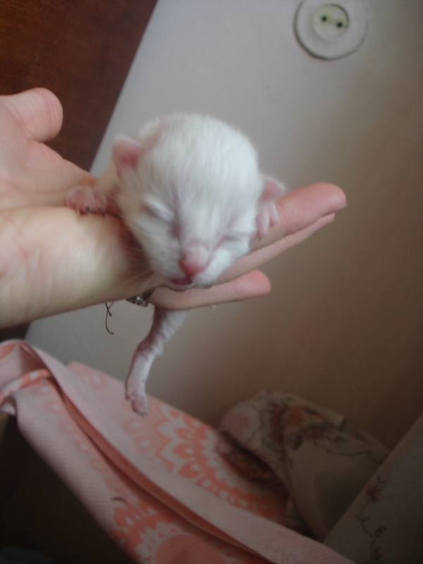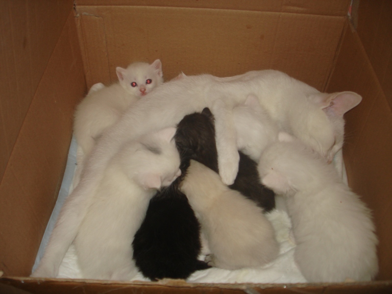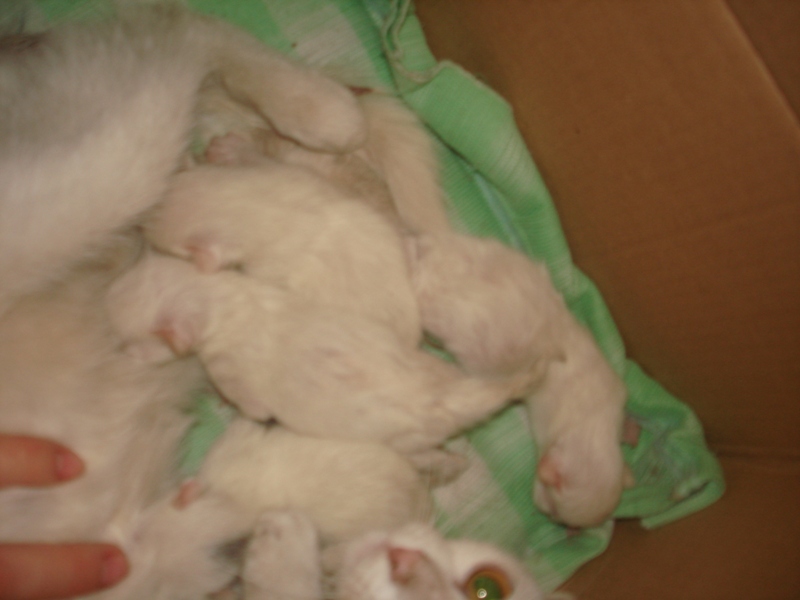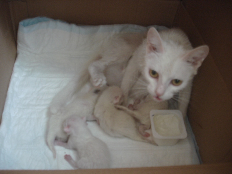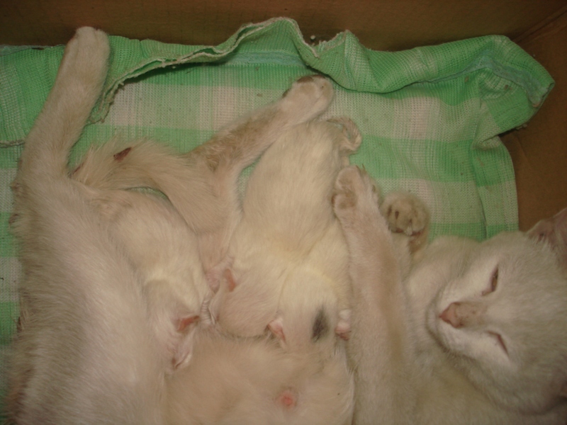 Позонила женщина мне, говорит у них в подъезде на 9м этаже родила кошка сегодня в 16-00, но женщина оставить себе не может у нее аллергия и у мужа тоже. Вообщем приехала я, забрала кошку, 4 новорожденных котеночка, определила на передержку. Все семейство чисто белое, но пока грязное Собственно чем нужна помощь: может быть у кого то есть корм, наполнитель лишний и с нами готовы поделиться Мы бы не отказались. Поеду проведывать семейку в среду, и будем мыть маму. Кстати скажите кошку естестнно от блох травить нельзя, а можно ли мыть шампунем от блох?