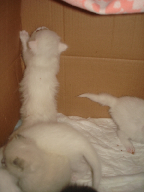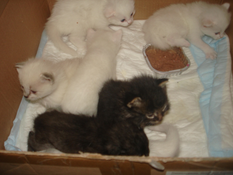 А у нас прибавление! Сегодня после работы нашла коробку с 3мя котятами. судя по тому что моим беляшикам 3 недели точно, то этим недели 2 отроду, еще глазки толком не открылись, кушать естественно не могут. Огромная благодарнасть нашей Сежи за то, что она любезно согласилась выкормить малявок И моей любимой передержки Леночки, Лена я это не забуду ни когда, если бы не ты, я даже не знаю что бы с малышами было бы