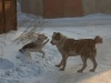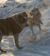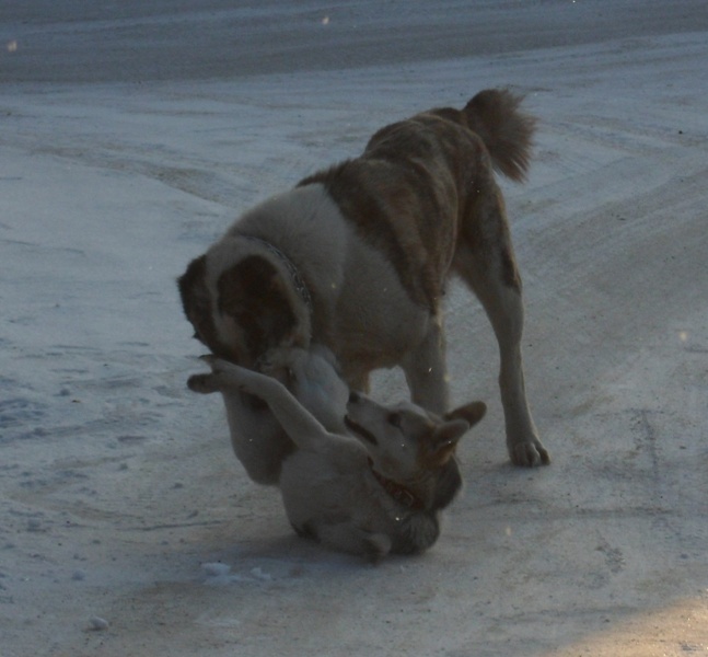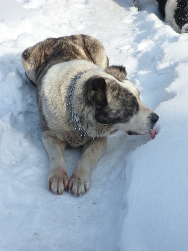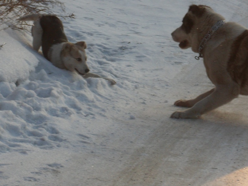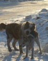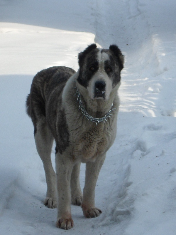 О самой собаке. По характеру очень уравновешенная и спокойная, спокойно ходит на поводке, реагирует, хоть и не идеально, на часть команд. К щенку агрессии не проявила, но эта маленькая бестия по-моему и мертвого достанет. Он был рад ее появлению несказанно. Тут же кинулся ей под пузо и повис на титьке - песа немного смутилась. Он с поросячьей радостью бегал за ней и то вис на подвесе, то тянул ее зубами за щеку, то покусывал. Она на все это порыкивала с разной интонацией, но терпела, но в какой-то момент видимо решила дать ему взбучки - прижала лапой и грызанула. Щен очень долго обиженно визжал и пылу у него после этого поубавилось.