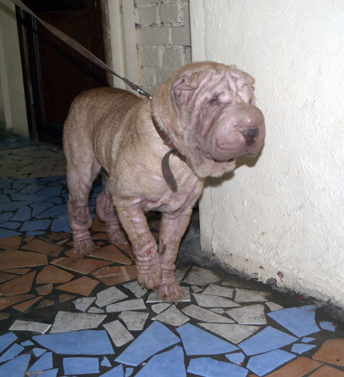 Теперь о состоянии собаки. Шарпеиха покрыта жёсткой прямой шерстью рыжего цвета. Голова у неё практически лысая и ноги тоже. Вообще она постоянно грызёт себе ноги, они кровят уже, чешется когтями или трясёт головой. У меня 3 варианта. Первый, и наиболее вероятный, что это запущенная аллергия, тем более, что заводчики мне вчера сказали, что это характерная для данной породы болезнь. Ну ещё это может быть, как мне кажется, клещ или лишай. Надо к врачу, конечно.