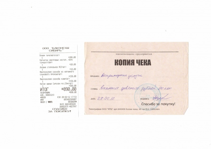 прикрепляю сканы чеков из Близнецов... расписку за корм, как только получу, вышлю кому-нить из комитета на почту...