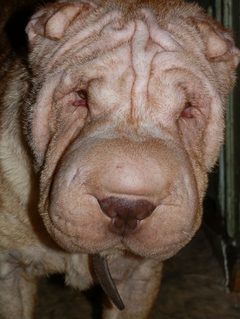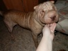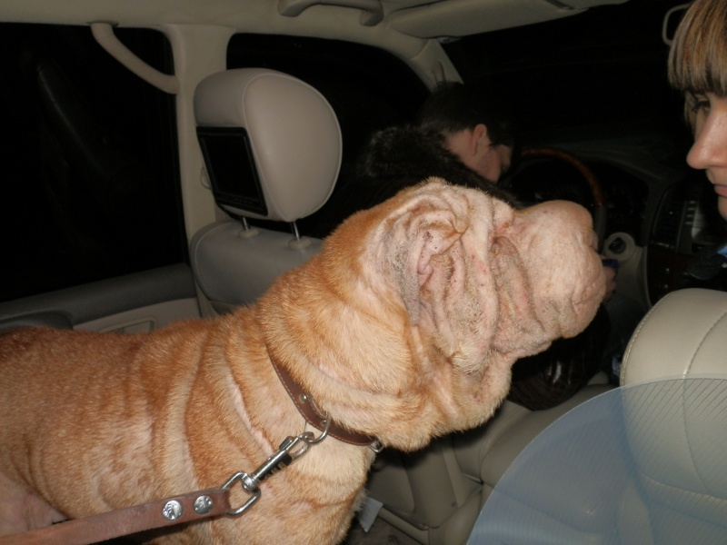 Теперь о состоянии собаки. Шарпеиха покрыта жёсткой прямой шерстью рыжего цвета. Голова у неё практически лысая и ноги тоже. Вообще она постоянно грызёт себе ноги, они кровят уже, чешется когтями или трясёт головой. У меня 3 варианта. Первый, и наиболее вероятный, что это запущенная аллергия, тем более, что заводчики мне вчера сказали, что это характерная для данной породы болезнь. Ну ещё это может быть, как мне кажется, клещ или лишай. Надо к врачу, конечно.