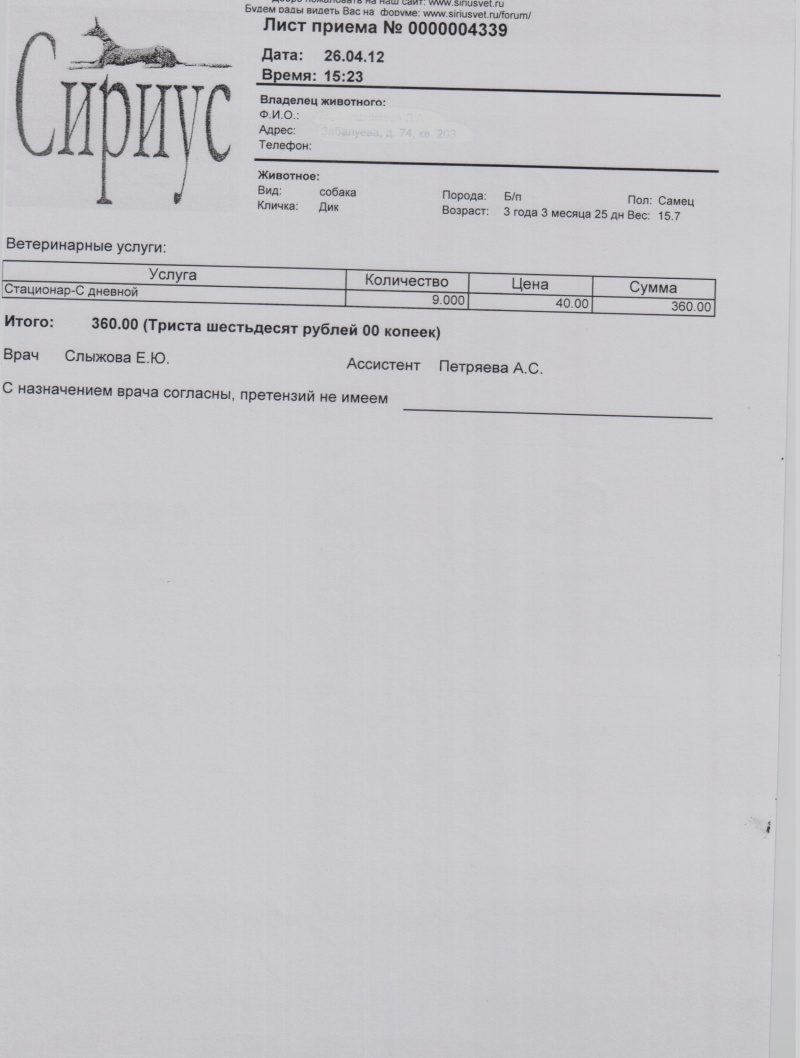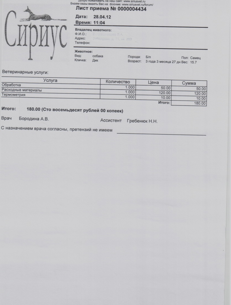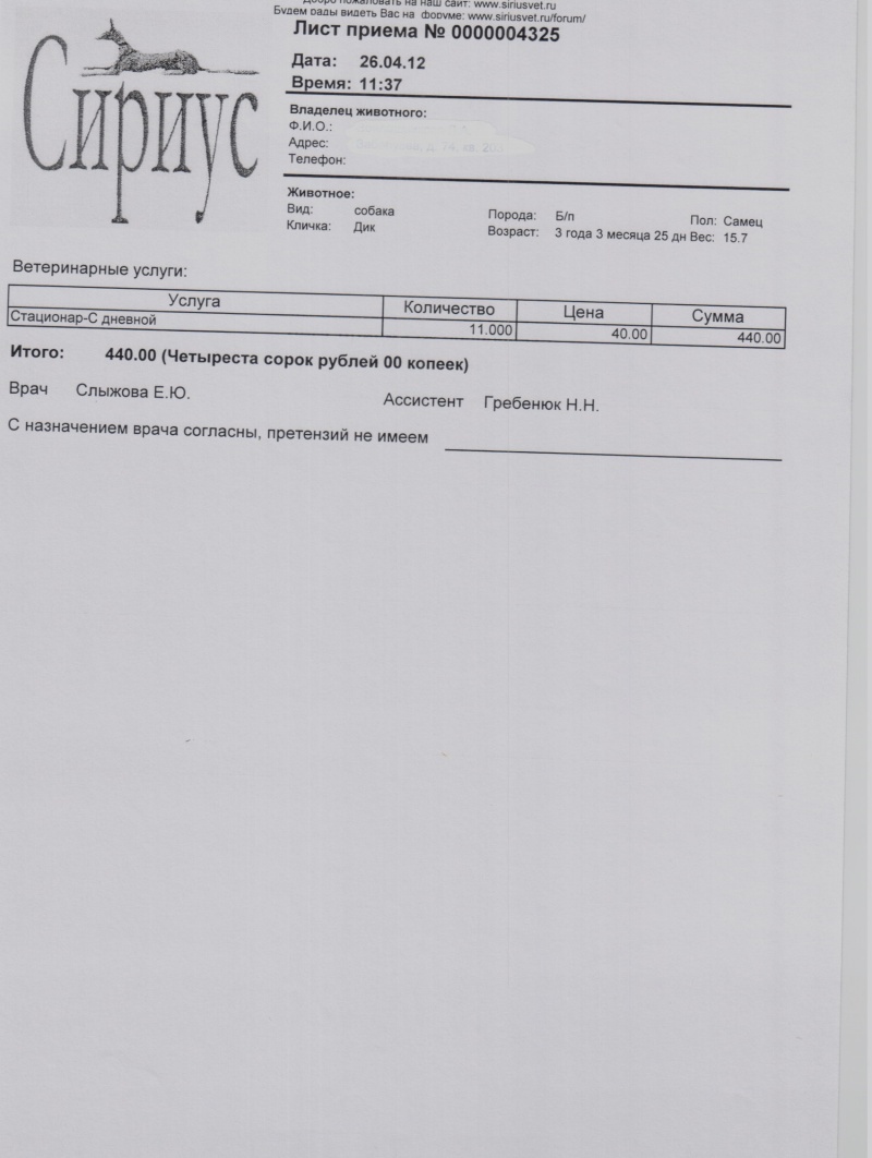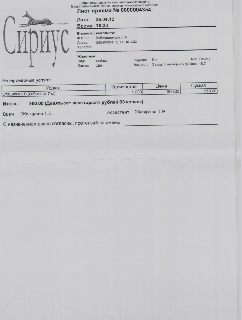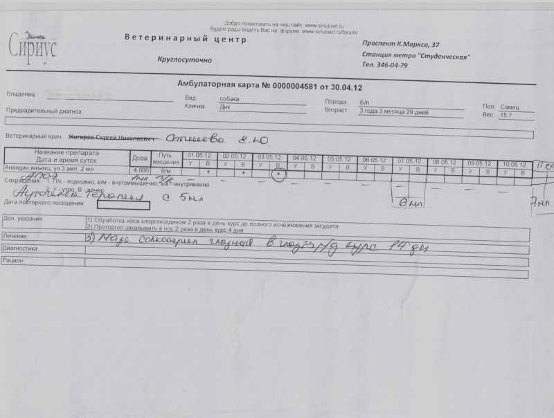 Ну а теперь о Дике, не в обиду Сириусу, все-таки они нам помогли, они единственные кто нас взял на станционар, правда жутко дорогой, мы сегодня съездили на консультацию к в ЦВК к Тетерину, все-таки беспокоит нас, что из носа течет гной, Тетерин О.А. сказал, что организму не хватает сил чтоб перебороть болезнь, и что при вирусных самое главное иммунитет, сейчас главное хорошие условия и питание, он предложил нам сделать ренген легких, так как он предполагает, что в легких скопился гной и может пойти абцесс или воспаление, а так как ренген легких он будет делать под легким наркозом и если обнаружится, что там гной, то он сразу все промоет, откачает. Плохо то что это сделать возможно только 10-го числа, не раньше, т.к. у него все расписано, а до 10-го это целая неделя и не известно как пойдут дальше события. А так состояние Дикушки стабильно-гнойное, из носа течет и глаз прищуривается.Ответ на сообщение Re: Нужна помощь собаке, пока не понятно какая пользователя Liliy76