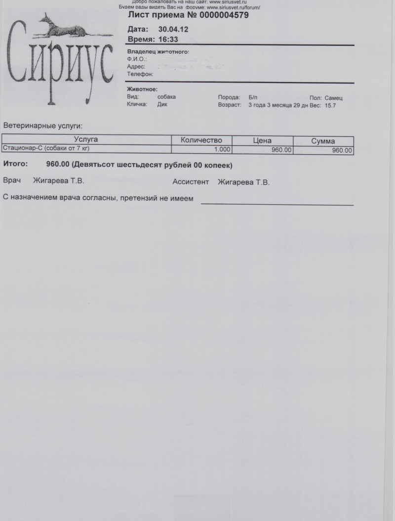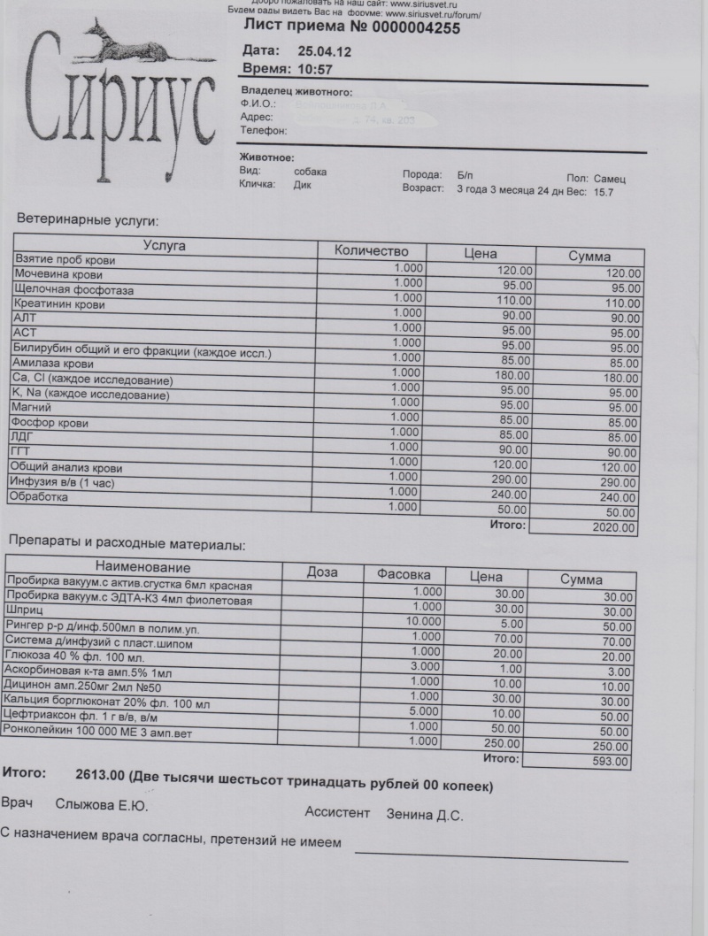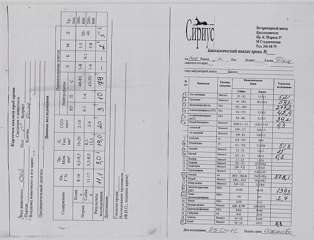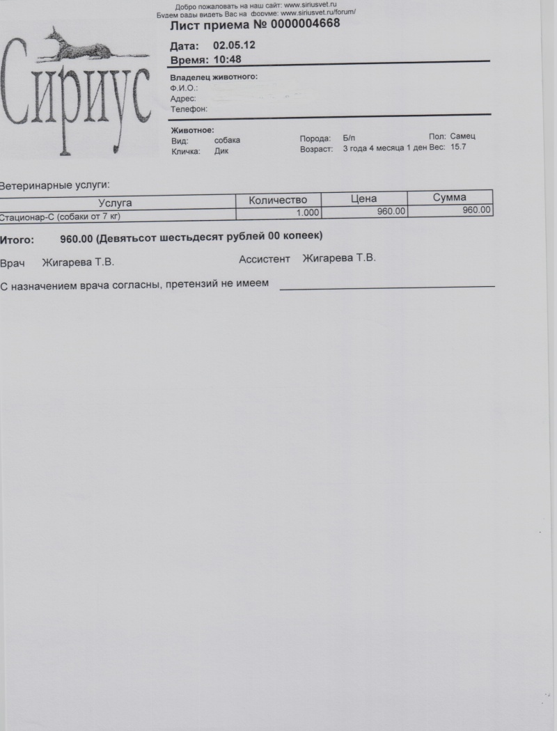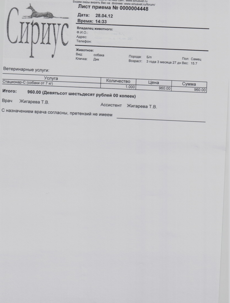 Ну а теперь о Дике, не в обиду Сириусу, все-таки они нам помогли, они единственные кто нас взял на станционар, правда жутко дорогой, мы сегодня съездили на консультацию к в ЦВК к Тетерину, все-таки беспокоит нас, что из носа течет гной, Тетерин О.А. сказал, что организму не хватает сил чтоб перебороть болезнь, и что при вирусных самое главное иммунитет, сейчас главное хорошие условия и питание, он предложил нам сделать ренген легких, так как он предполагает, что в легких скопился гной и может пойти абцесс или воспаление, а так как ренген легких он будет делать под легким наркозом и если обнаружится, что там гной, то он сразу все промоет, откачает. Плохо то что это сделать возможно только 10-го числа, не раньше, т.к. у него все расписано, а до 10-го это целая неделя и не известно как пойдут дальше события. А так состояние Дикушки стабильно-гнойное, из носа течет и глаз прищуривается.Ответ на сообщение Re: Нужна помощь собаке, пока не понятно какая пользователя Liliy76