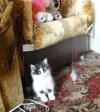 Девице неполных полтора месяца. Мы засвидетельствовали ветеринару своё почтение. Которебёнок жива, весела, здорова. Судя по фото, всегда готова к к приключениям на свою попу, украшенную симметричными пятнами. Несмотря на юный возраст, Кука (а она похожа на куклёнка) дерзит хозяйке дома Бусе. Но это не страшно: у Бусинатора в последнее время корона на круглой кошачьей головке слишком плотно сидит.