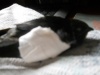 Муж нашёл у себя пластмассовый пинцет, и я стараюсь им закидывать корм птахе в клюв. Если червяк или кусочек мяса наполовину в клюве, то ласточка-стриж языком затаскивает остальное. Язык у неё очень необычный, посреди него какой-то "выдвижной" второй язык, только в другую сторону (не знаю, как правильно объяснить).
