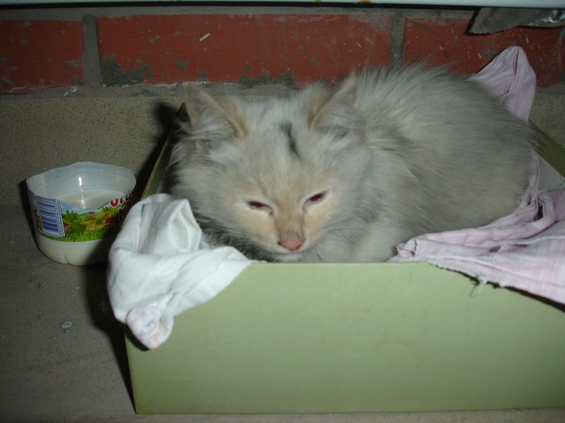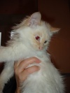 О котятах: девочка Мимоза-просто красавица, вся белая, только хвостик и ушки бежевые, глаза голубые, очень застенчивая и ласковая, мурчит все время, очень нежная. Сейчас на ней пятна машинного масла, т.к. сидит под машиной.