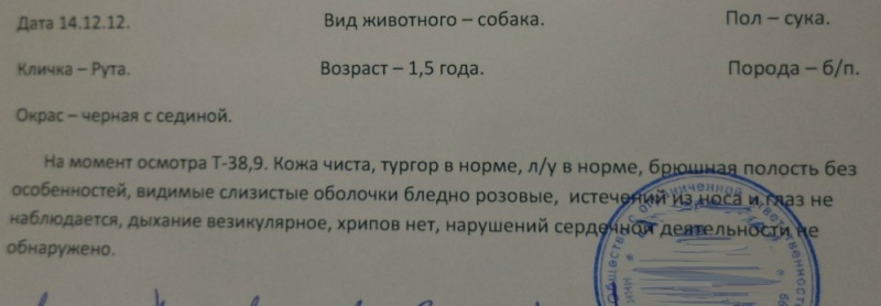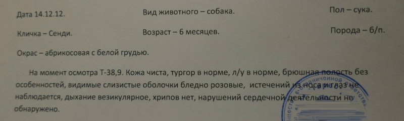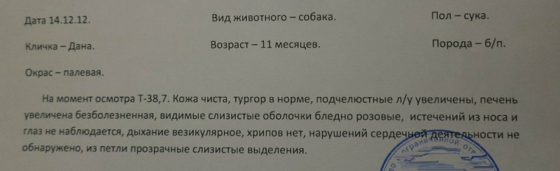 • В ответ на: 6. В данный момент на передержке нет ни одной больной собаки, все здоровы, что подтверждает осмотр ветеринара и справки. Последняя заболевшая собака была 04 декабря- Дана. Она легко болела чумкой 3 дня.