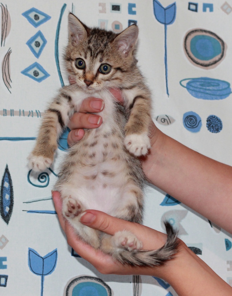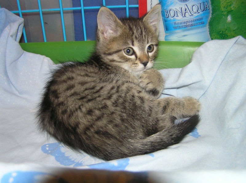 Котенку не более 2-х месяцев, т.к. глаза еще не перецвели (бусенькие как говорят в народе). Прелестный как все агути.