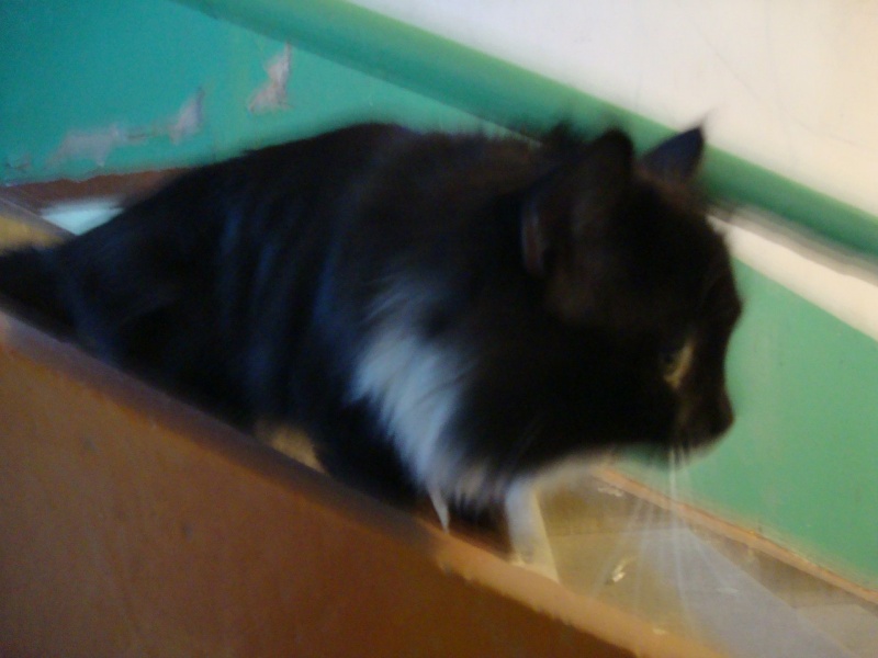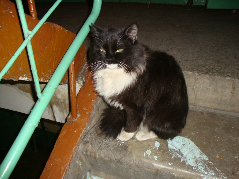 В подъезде появился котик. Чёрно-белый. Маневрирует по этажам,но больше находится на последних (видимо,чтобы не встречаться с собакакми).