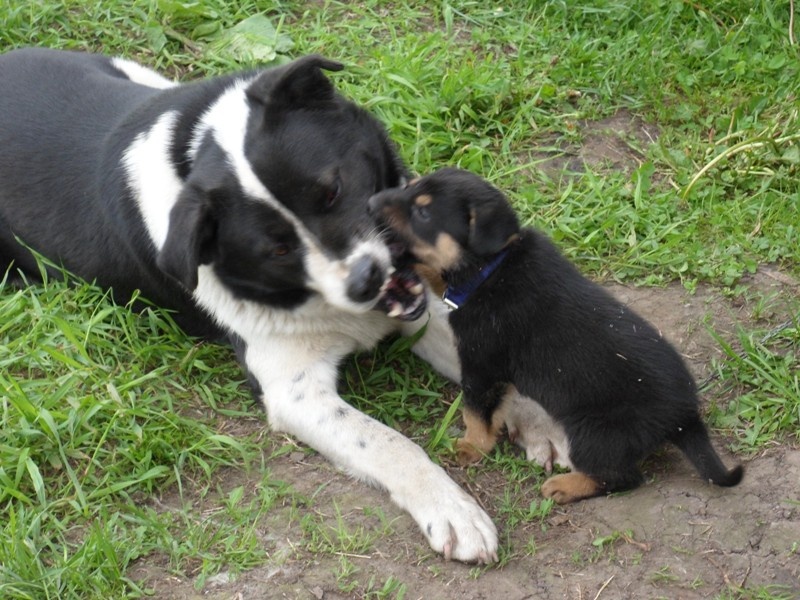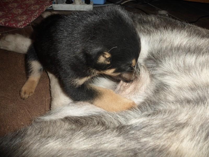 Мергене щен обрадовался страшно, кинулся под пузо и повис на титьке. Мергена само собой не сильно обрадовалась такому повороту событий, т.к. стать кормящей матерью в ее планы в данный момент по-моему не входит, о чем она немедленно поспешила сообщить - ласково оскалившись.