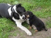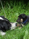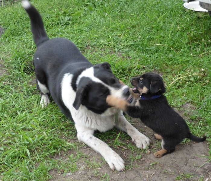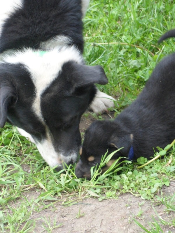 В выходной были на даче, там Прохор как настоящий цепной пес сидел на "цепи", которая вроде и не ограничивала, но свалить по-тихому не давала. Взрослым были куплены огромные говяжьи лопатки с мясом - это у них еженедельный подарок выходного дня. Кто-то из псов, пойдя попить, имел неосторожность оставить свою кость без присмотра, так Прохор, схватил ее, упер под машину и там с остервенением грыз. (На что естественно вечером у него расстроился кишечник. Страшного ничего не произошло конечно, попил смекты и все нормализовалось, но не по возрасту еще ему такие вещи как сырое, хоть и свежее мясо). На даче ему весьма понравилось, весь день пробыл на улице. Из собак с ним играет только Ник, учитывая, что он вообще кобель, но у него есть "материнские чувства". Он щенка и оближет и обнюхает и играет с ним в поддавки и понимает, что в игре прикусывать нельзя. Вообще конечно интересно за этим наблюдать. Ник впринципе очень любит маленьких щенков и умеет с ними обращаться именно как мать, т.к в свое время ему приходилось воспитывать щенков на стоянке, которых ему подкидывала сука и уходила, а ник сидел на цепи и деться ему было некуда. Что самое обидное - щенки были не его. Мергена и Мишель делают вид, что они его не знают и не замечают и вообще он с нами не живет. Мергена ведет себя как бабка, которой дети решили подкинуть внуков и дает понять, что ей свои в свое время надоели, а Мишель просто еще очень молодая и вообще не понимает, что это щенок и играть с ним как с ровестником не получится. Поняв, что бегать за ней он не будет - потеряла к нему всякий интерес.