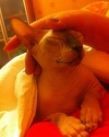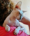 Что имеем мы сегодня, как наши отношения. Кошку, зову ее Доночка, я смогла помыть в первый день, теперь она чистенькая и главное у нее стали чистые глазки, совсем нет никаких выделений, даже ранки на веках и над глазками прошли. Кушает хорошо, убрала влажный корм, стул стал формироваться, ходит строго в горшок. Пьет водичку. Так же много спит.