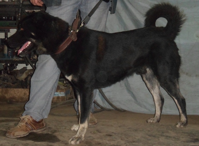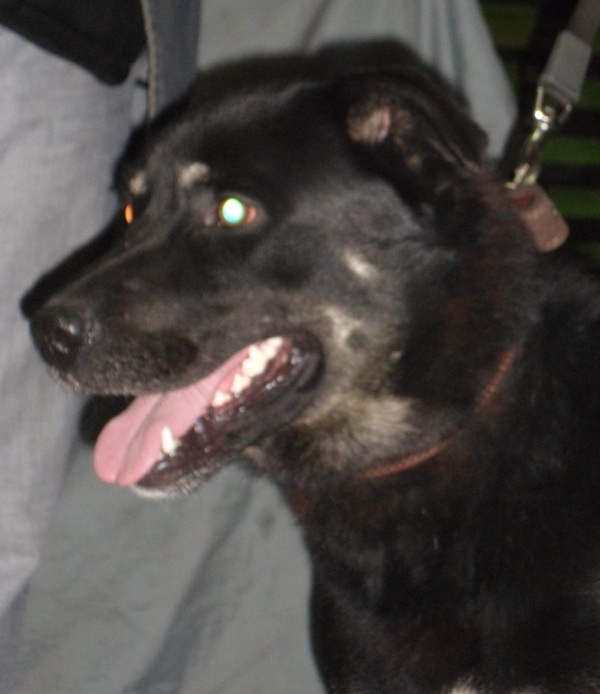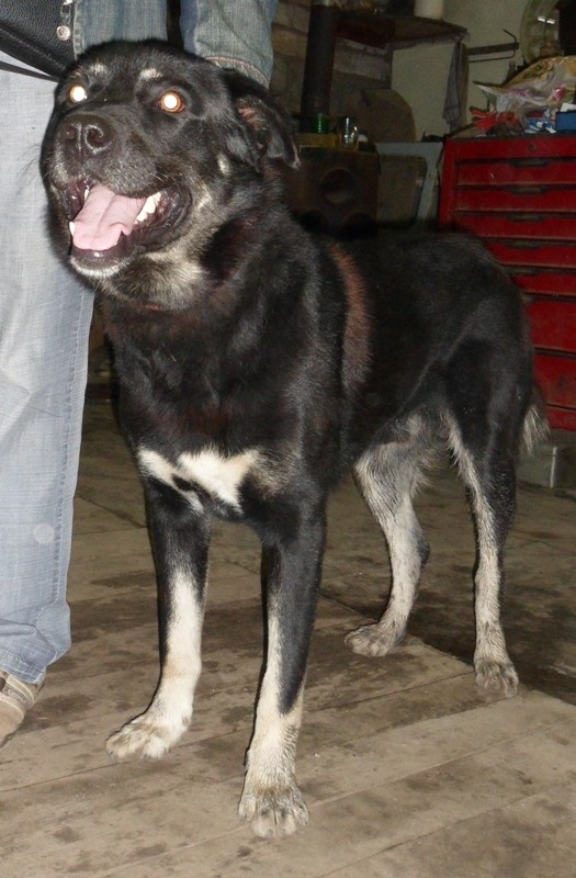 Описание собаки: Молодой, очень крупный кобель (ростом с мою Мергену), с крупной головой (голова выдает помесь с ротвейлером) и небольшими висячими ушами, на голове шрам переходящий на правую бровь. Длинные прямые лапы, поджарый. Окрас черный с серым подпалом. Длинный хвост, который кольцом закладывается на спину, кончик хвоста белый. На шее очень явный след от ошейника. На первый взгляд выглядит вычесанным и ухоженным. На поводке ходить не умеет (тащит), но идет не выворачиваясь, спокойно заходит в двери. Собака явно, без вопросов хозяйская.