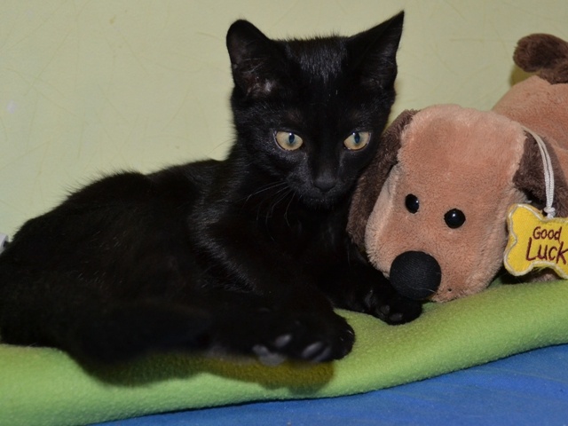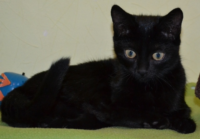 Новоиспеченный котенок - девочка вроде. Я не посмотрела, отдала детям после музыкалки, чтобы отнесли домой и накормили. Черная без белого на беглый взгляд. Месяца два.
