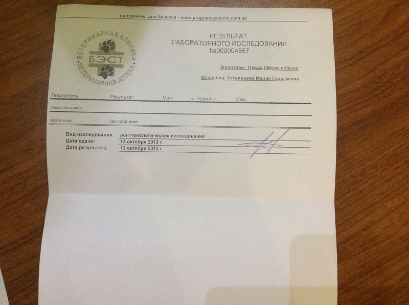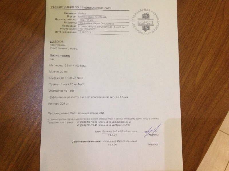 В Бэсте сделали рентген всех отделов позвоночника: патологии не нашли. Каждый раз, когда я отходила, Найда начинала жутко выть и пытаться вставать. Но только барахталась на одном боку и ничего не могла сделать. Народ в очереди был просто в тихом шоке... Короче, в Бэсте поставили предварительный диагноз по клиническим симптомам: контузия (ушиб) спинного мозга, назначили обследование (общий анализ крови и биохимию, УЗИ внутренних органов) и инфузионную терапию с гормонами. Согласились взять на стационар на полтора суток, пока не найду передержку. Оплатила 7000 (сказали, что примерно столько будут стоить все обследования, прием и лечение до завтрашнего дня, из них 3390 взяли за уже проведенные обследования и прием, 3610 осталась предоплата).