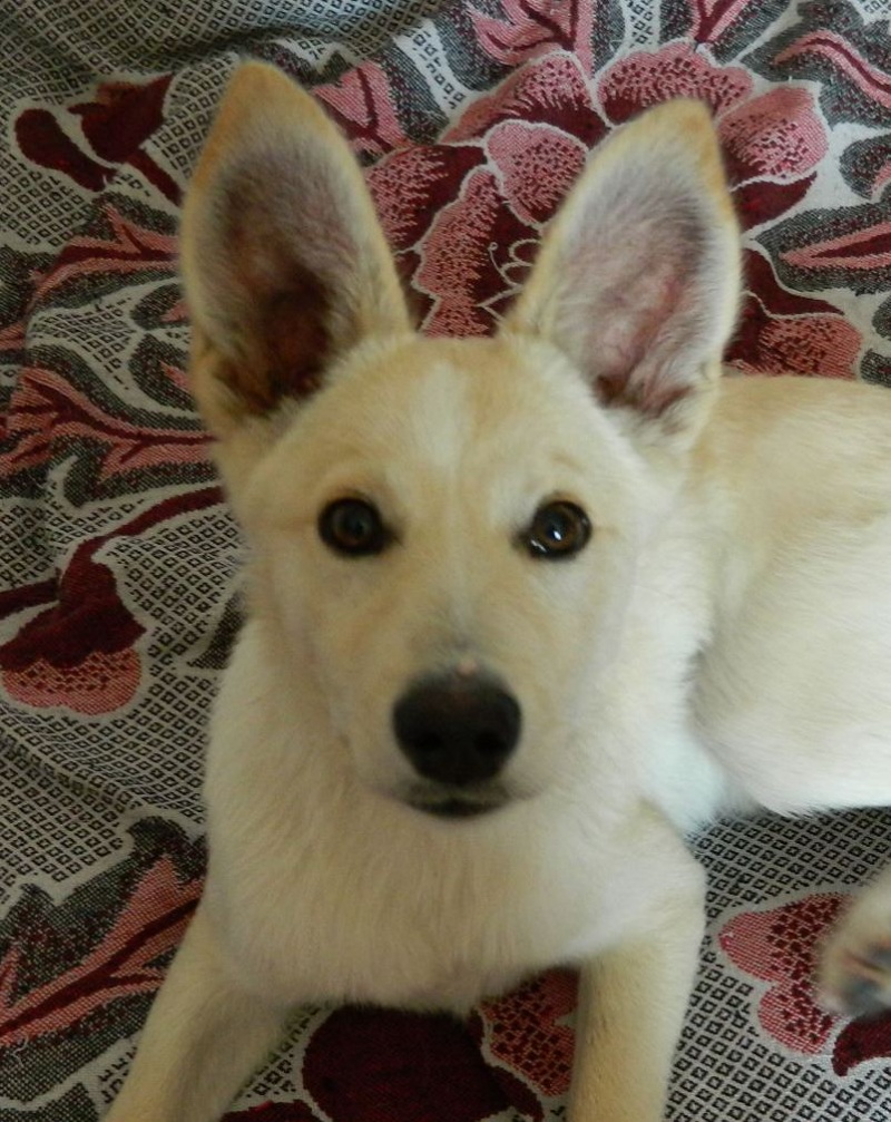 Две недели назад во дворе "добрые люди" привязали белого подростка, дети отвязали, щенок оказался активный, игривый. С радостью шел к людям, гулял с домашними собаками. Догулялся. Вызвали отлов. Увидела их машину, успела забрать чуть раньше.