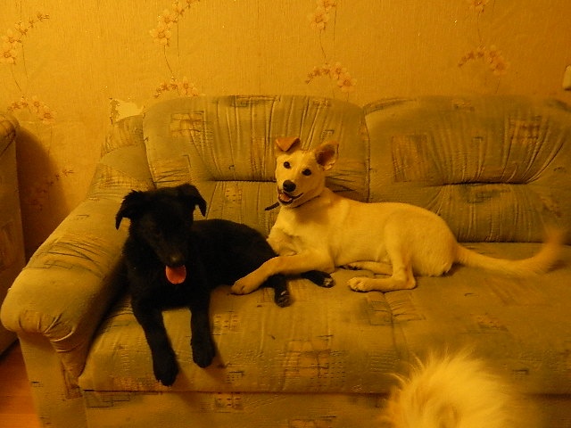 Теперь имею дома зоопарк. Один щенок белый, гладкошерстный, среднего размера, возраст месяцев 6, растут клычки, активный, жизнерадостный. Вторая девочка, такого же примерно возраста, зубки уже поменялись, но видны остатки молочного клыка, размера будет скорее всего со спаниеля или меньше. Спокойная, ласковая.