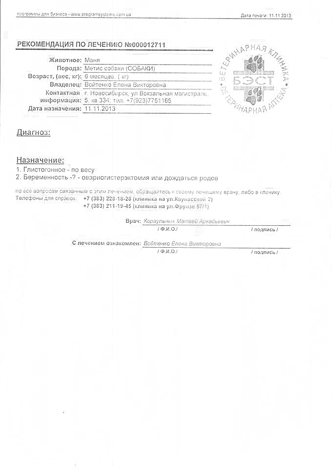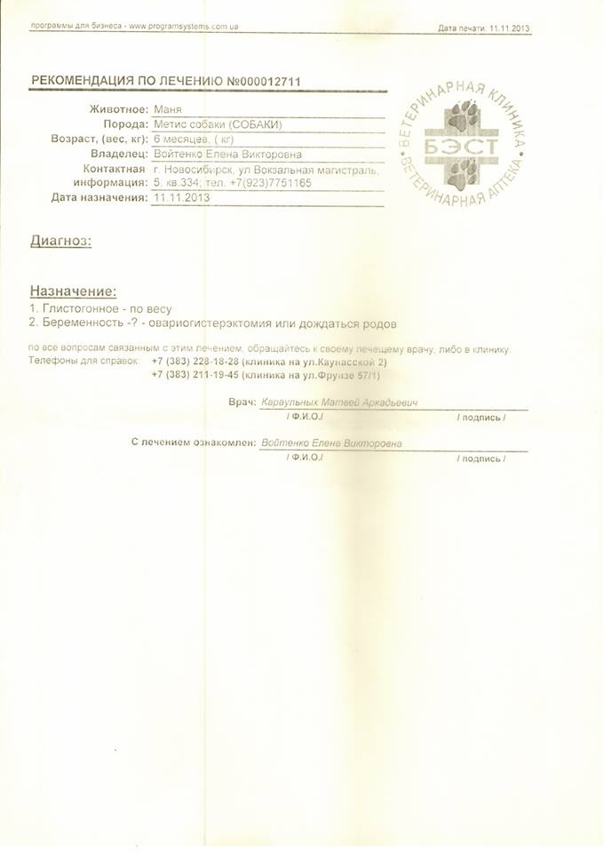 Вчера с Еленой свозили её к вету, собака беременная, срок небольшой, врач рекомендовал в случае проведения стерилизации сделать её непозднее 17.11. Собака записана на стерилизацию на 14 ноября.