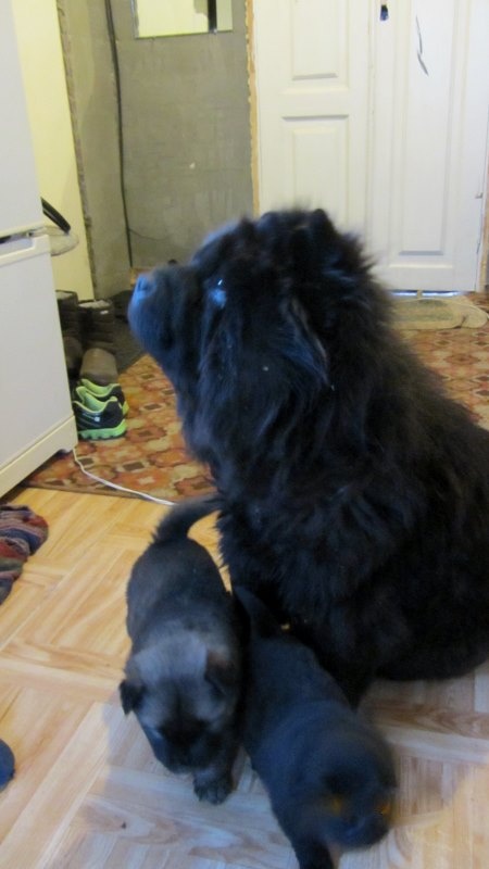 Она прокараулила свою чау-чау и та родила трех очаровательных щенков-один кобелек и две сучки. Пока они были маленькие, о них заботилась мама, а сейчас они бегают по всему дому,а убирать за ними она не может.К ней приходят и помогают по хозяйству, а щенки не входят в это. Она просит как можно быстрее забрать их от нее. Щенки красивые,толстенькие,спокойные и похожи на медвежат.
