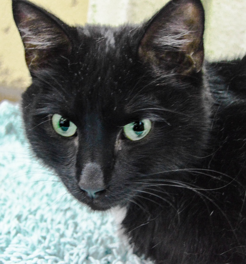 В Октябрьском районе (ул. Толстого) в подъезде найден кот. Черный с белым пятном на груди, белым животом и лапами. Видно, что домашний, скучает....Потрясающие зеленые глаза и черные усы.