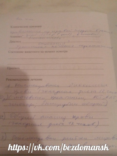 Очень извиняюсь что так поздно,но куча дел( Были сегодня в вет. клинике. Она посмотрела все бумажки диагноз остался тот же. Добавилось к это му ХПН,лечение тоже что и в БЭСТЕ. У меня были опасения из-за того, что кот не может сесть на попу и когда кушает трясутся задние лапки...так это давняя травма копчика. Снимок сделать можно было,но врач сказала что не сможет уже помочь. Из рекомендаций: соблюдать диету кормом лечебным,меньше стресса,следить за потреблением жидкости. Киста растёт и почки отказывают. Денег с нас не взяли ни копейки за приём! Огромное спасибо ВАМ за врача! Для себя решила...буду ходить только туда! Для отчёта попросила написать хоть что-то,сделали запись в карте,хоть и было очень не удобно просить...коль денег брать не стали.
