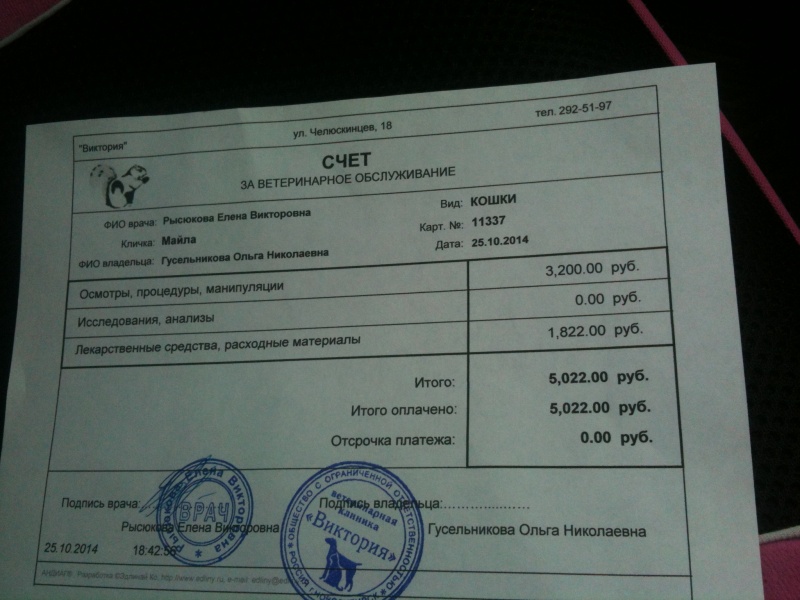 Майма лечится в клинике в долг. Счет на оплату выставят по окончании лечения и выписки кошечки из стационара. Пока на руках у Ольги есть только те документы, что выложены в начале темы. Завтра Оля позвонит в клинику и узнает приблизительную сумму, требуемую для оплаты. Очень нужна помощь в оплате!